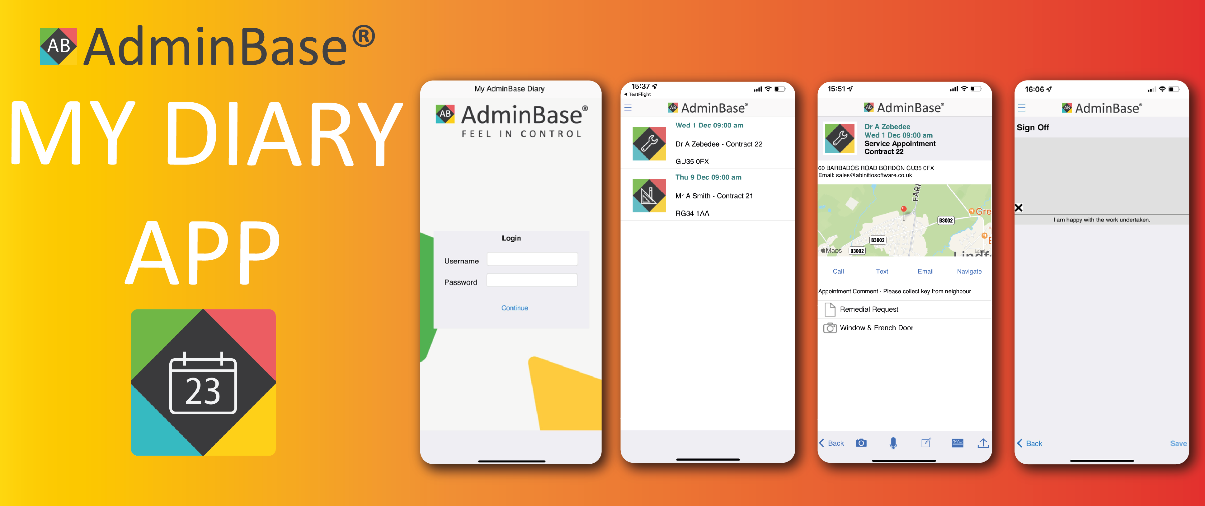 The My AdminBase Diary app allows personnel in the field to see their appointments and associated documents stored in AdminBase and to submit back notes, voice memos, pictures, documents and a signature to the lead or contract record in AdminBase. The app is available for Android and Apple devices on the relevant app store.